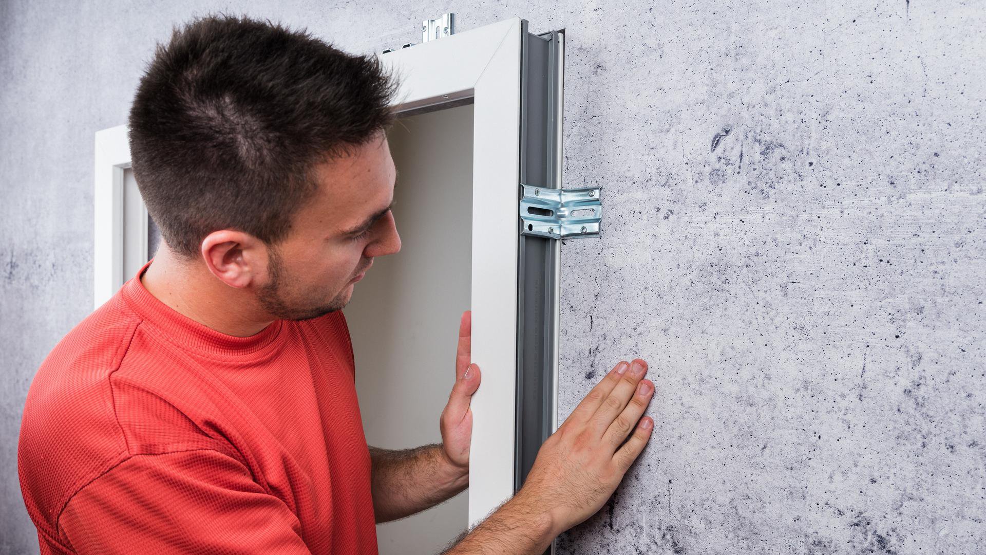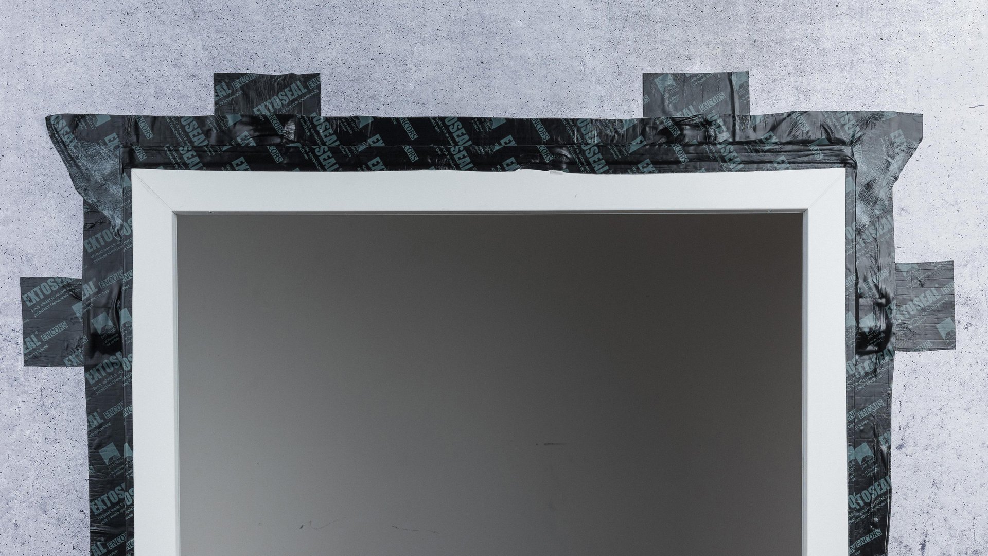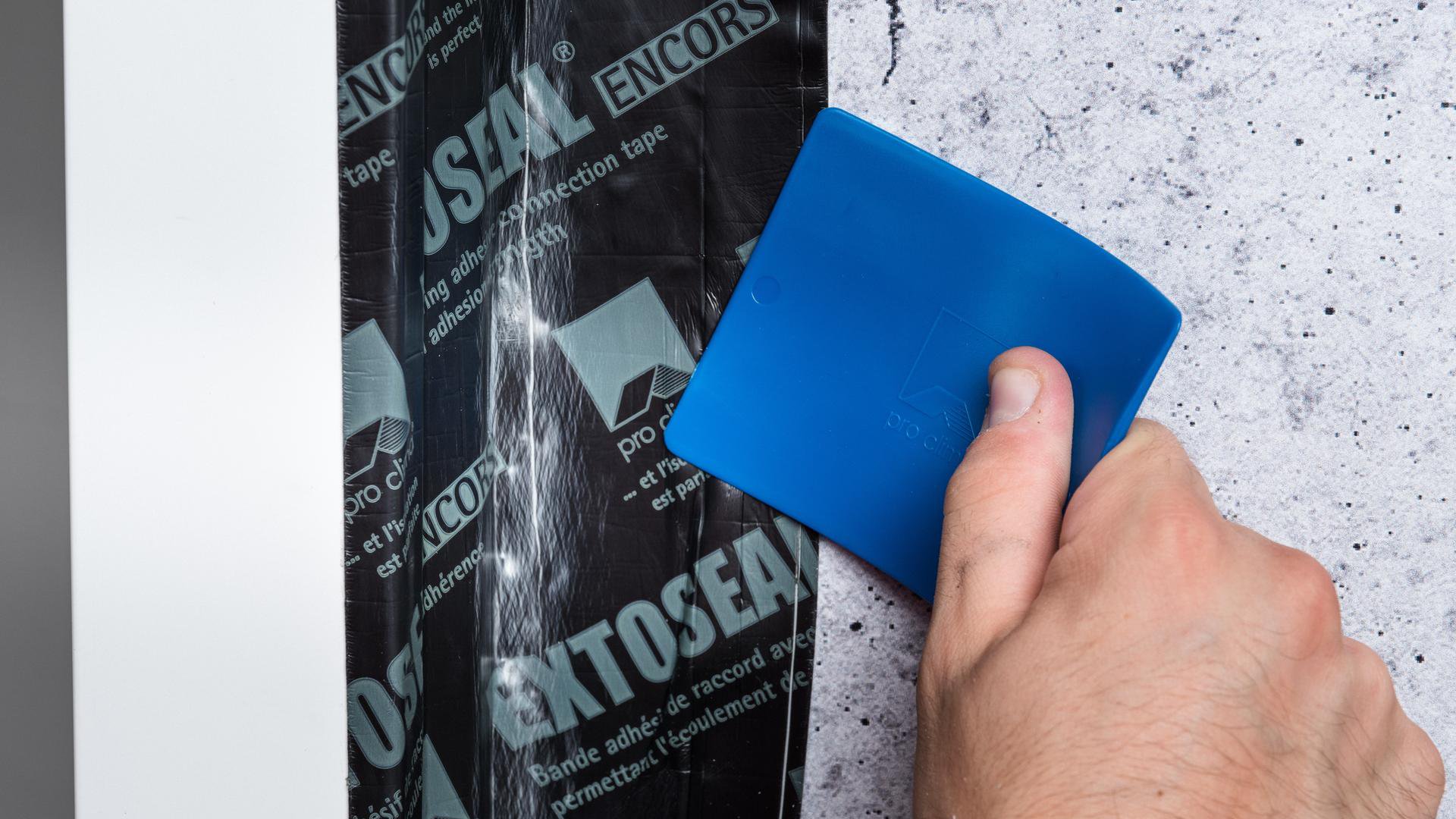Pre-stretch EXTOSEAL ENCORS uniformly so that the adhesive tape can be stuck around the corners of the window frame – both to the frame and to the masonry/concrete – without any tension. After sticking, rub the tape firmly into place using the PRESSFIX application tool.