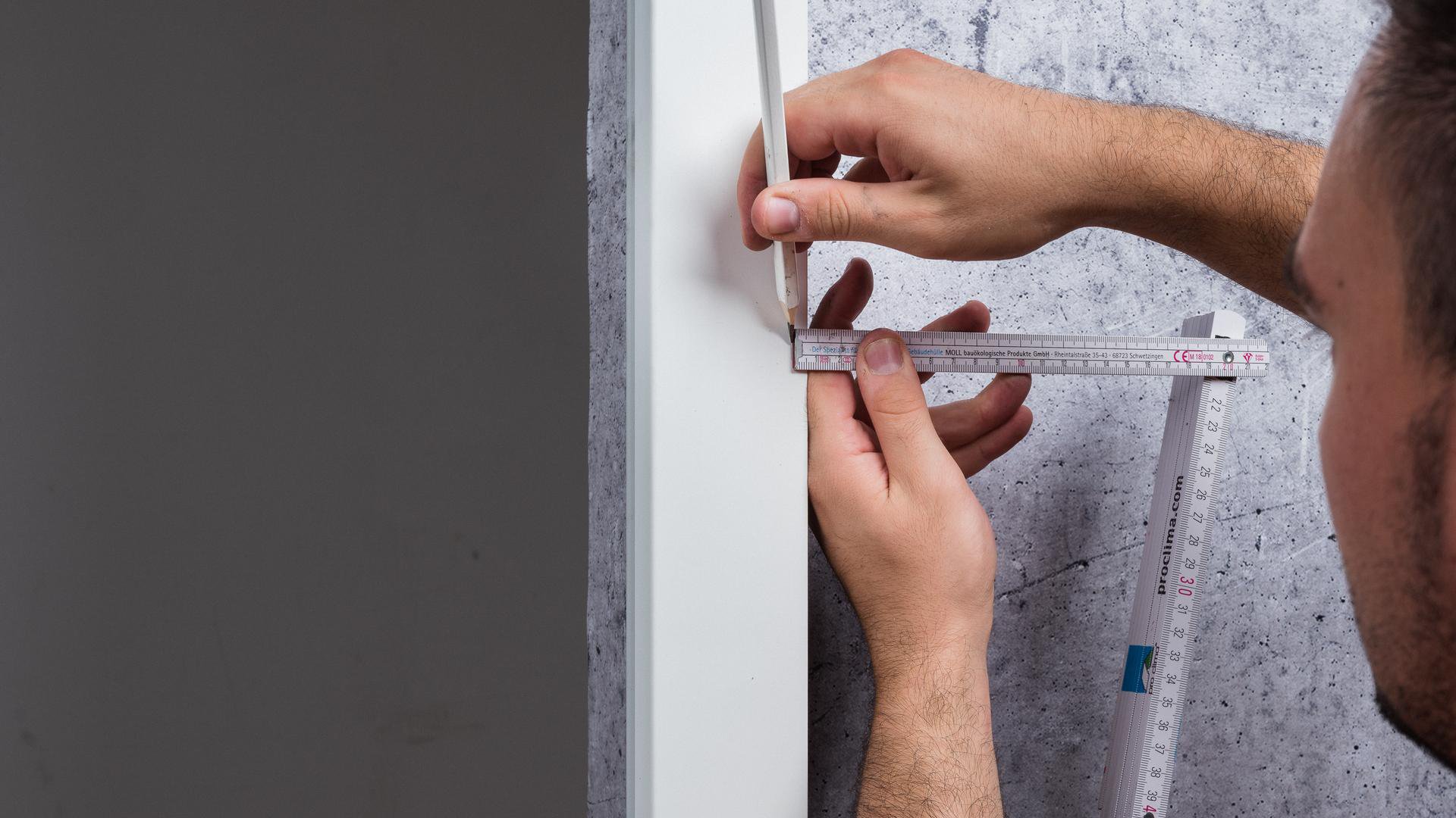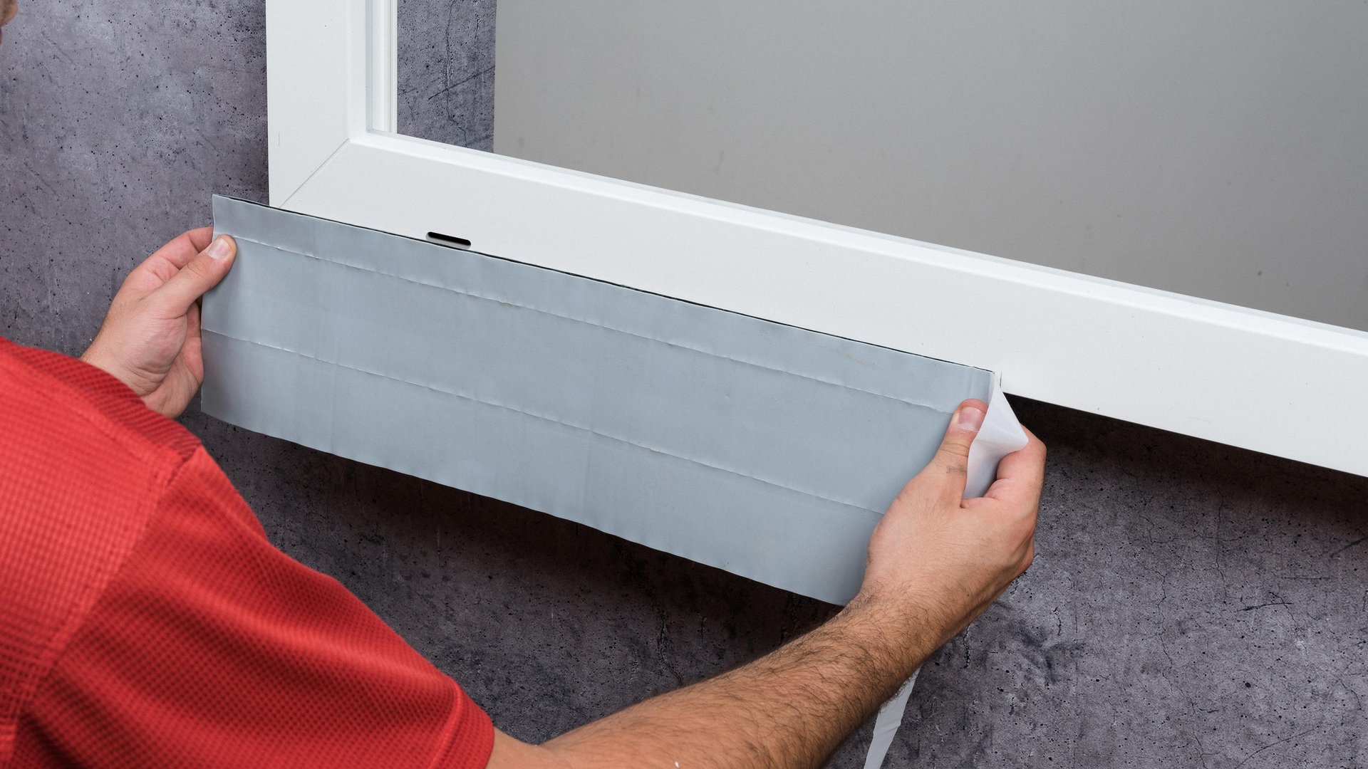 Apply the tape in a waterproof manner, starting at the bottom of the window and working up. Fold the tape to half of its total length and remove the narrow release film strip on one side. Position the tape at the marking at the centre of the window and stick in place. Remove the rest of the narrow release film strip, unfold the adhesive tape and stick it to the window frame. The excess length at each side will then be the same.