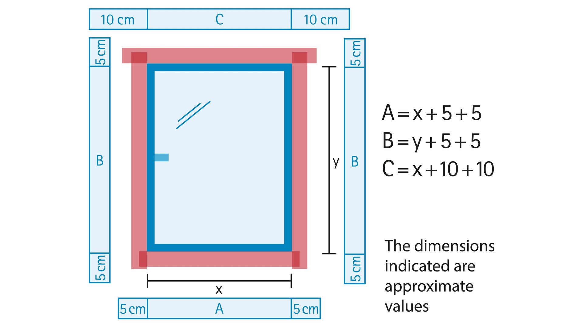 When cutting tape lengths for the bottom and side sections, add 2 x 5 cm (2 x 2”) to the relevant frame dimension, and add 2 x 10 cm (2 x 4”) for the top tape length so that waterproof adhesive joints can be created at the corners later on. If the adhesive joints are created using a number of shorter lengths of tape for a particular side, the tape overlap must always be at least 2 cm (3/4”) at tape joints.